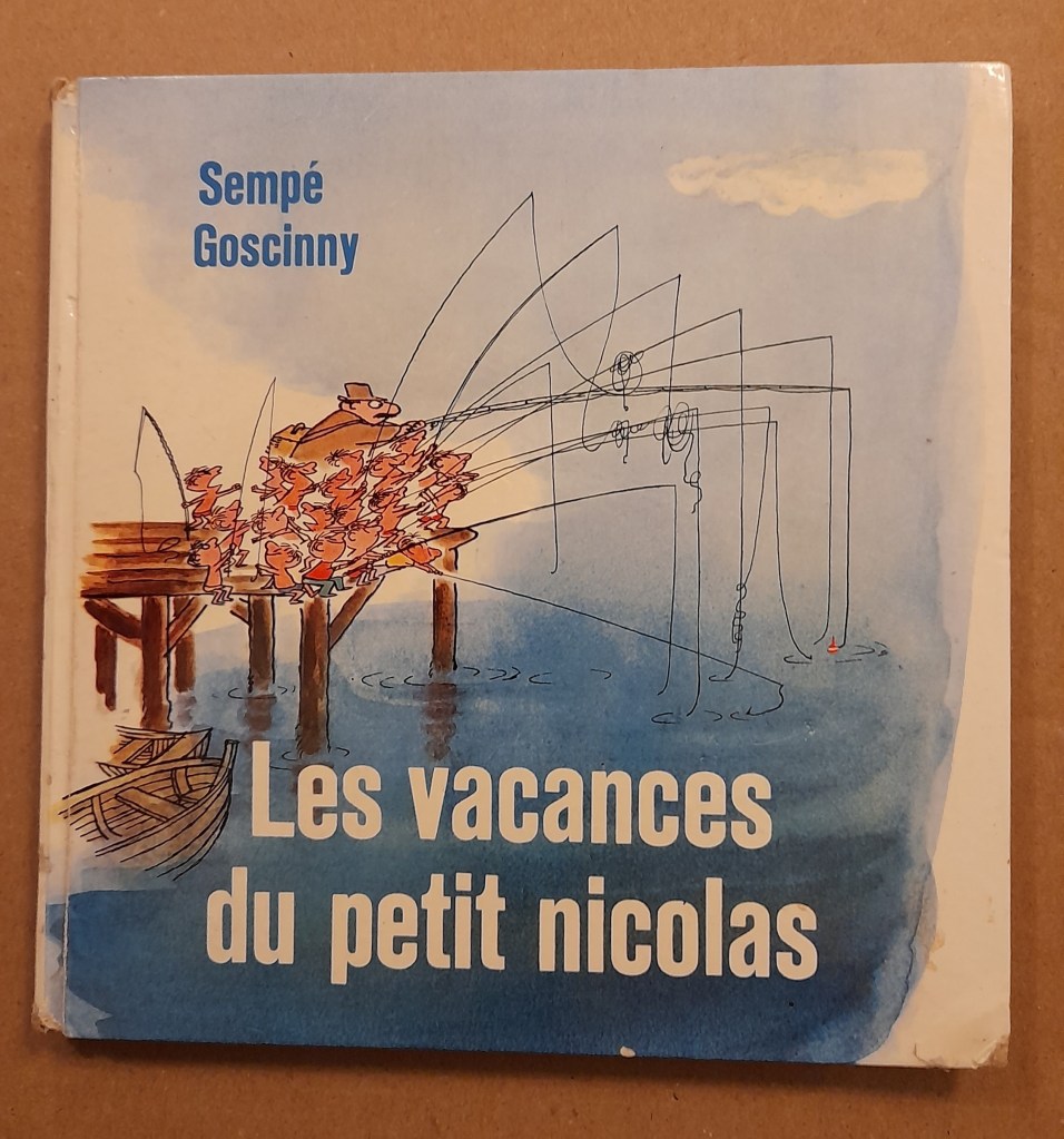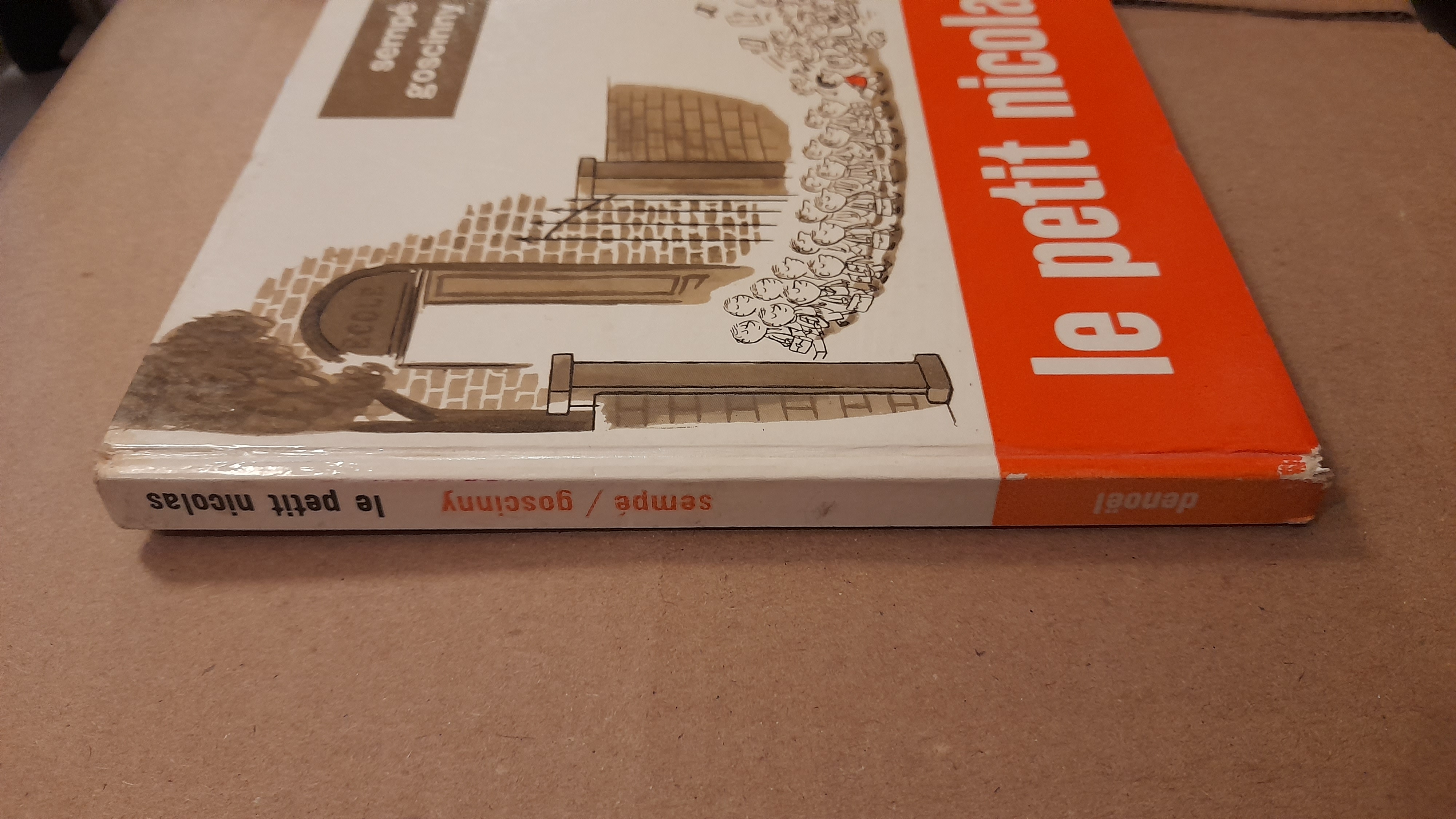 « Les Vacances du Petit Nicolas »: achevé d’imprimer le 26 mars 1962. Envoi de René Goscinny et petit dessin de Sempé (une fleur). Intérieur propre bien que jauni. Reliure en l’état (voir les photos). Tampon S.P. au dos. 250 euros