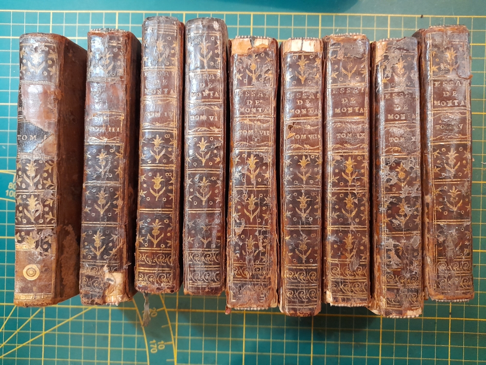 A part le tome 9 dont l’intérieur n’est pas en très bon état, les volumes sont propres. Quant à leur reliure, elle diffère selon les tomes (cuir « grignoté » ?) mais les charnières sont solides.