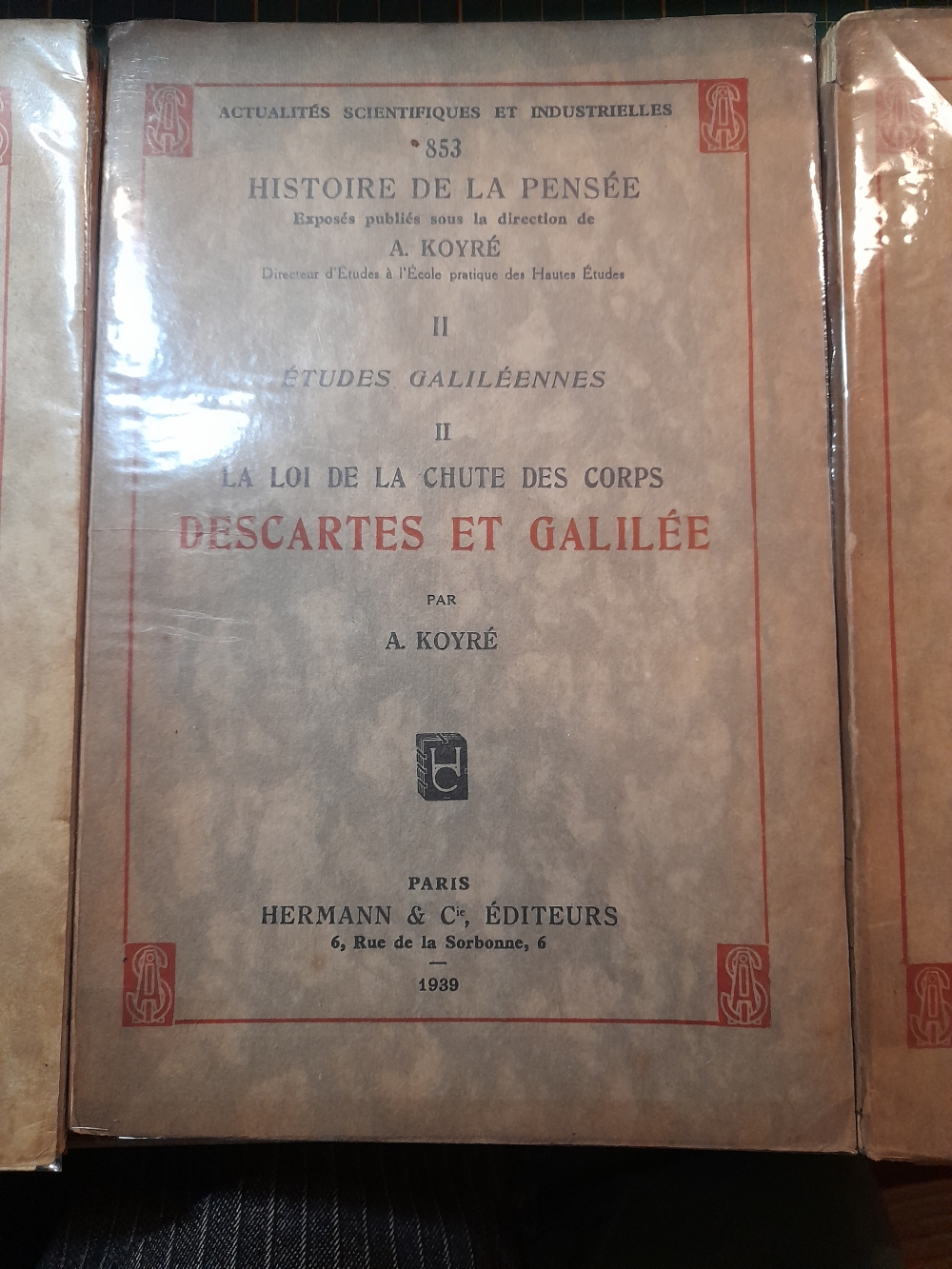 Actualités scientifiques et industrielles, numéro 854, 855 et 856. Tome 1 : A l’Aube de la science classique ; Tome 2 : La loi se la chute des corps, Descartes et Galilée ; tome 3 : Galilée et la loi d’inertie.