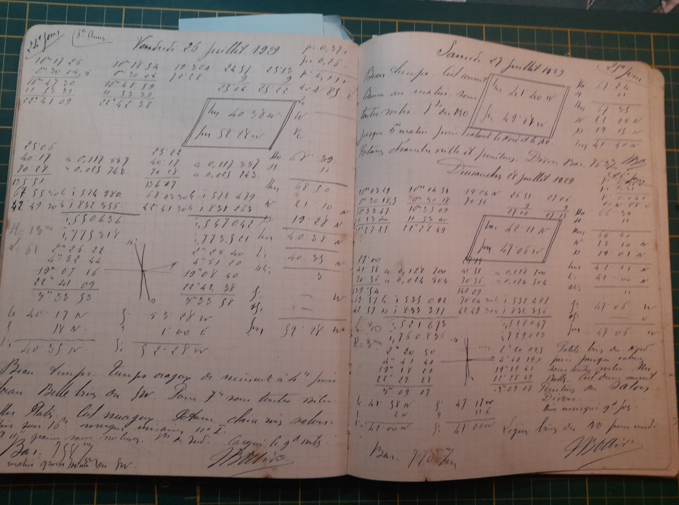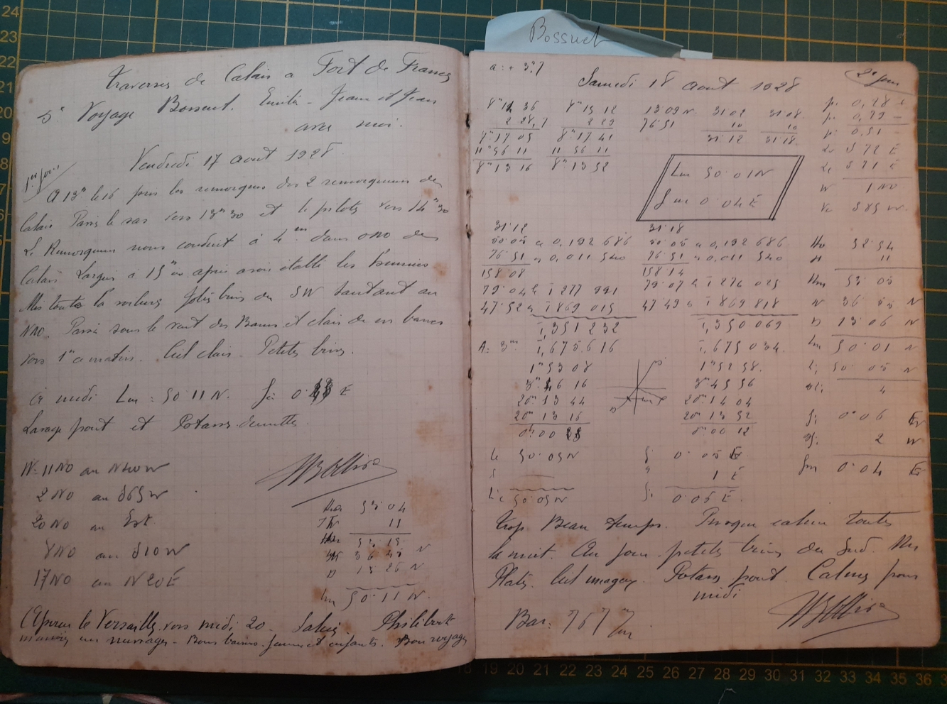 Le cahier est bien sûr constitué principalement de calculs nautiques mais présente aussi des pages entièrement rédigées et parfois de petites annotations personnelles.
