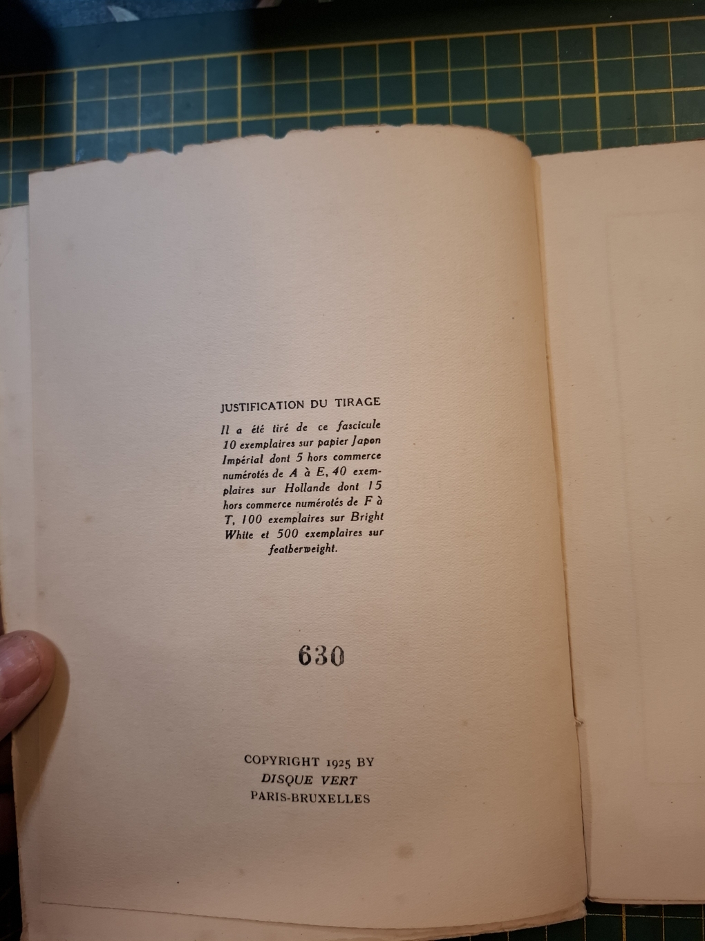 Intérieur frais mais couverture en état d’usage. Notre exemplaire porte le numéro 630, et fait partie des 500 exemplaires sur featherweight.